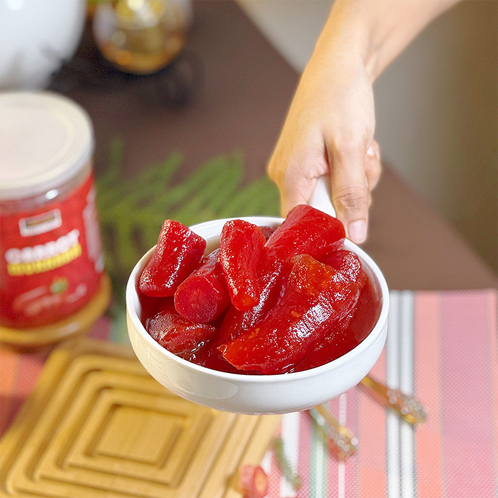 Our Carrot Murabba is a wholesome sweet preserve made from tender, fresh carrots simmered with natural sweeteners and warming spices. This traditional delicacy brings together nutrition and flavor—perfect for a comforting bite or as a delightful side with your meals.