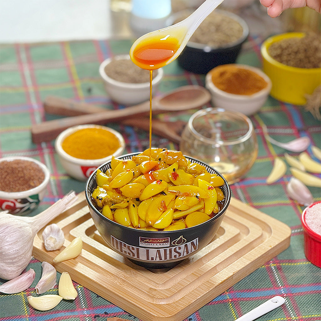 Crafted with care using the finest garlic cloves from Sindh, our Garlic Pickle (Lahsan ka Achar) is a bold and flavorful treat for desi food lovers. Each batch is slow-marinated in traditional spices and pure mustard oil, resulting in a rich, tangy, and spicy pickle that brings every meal to life.