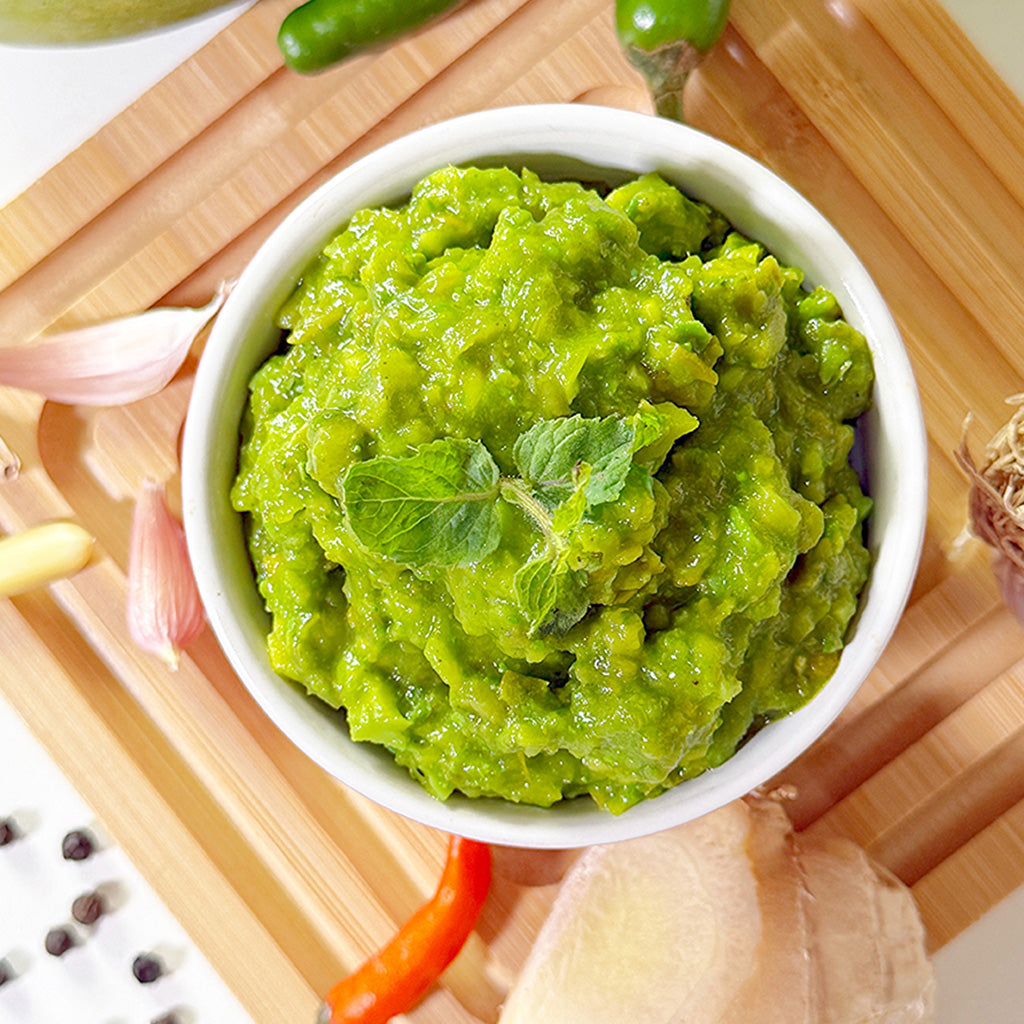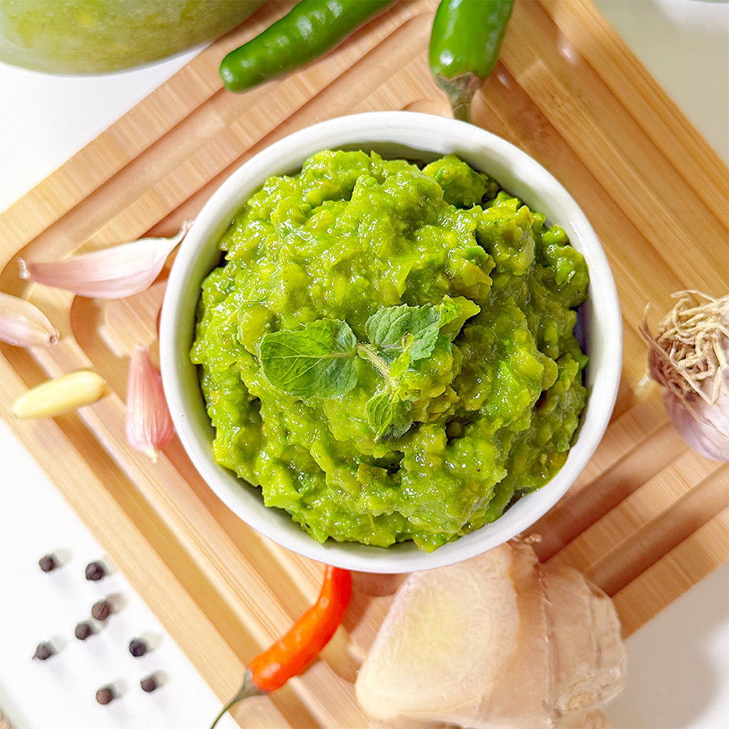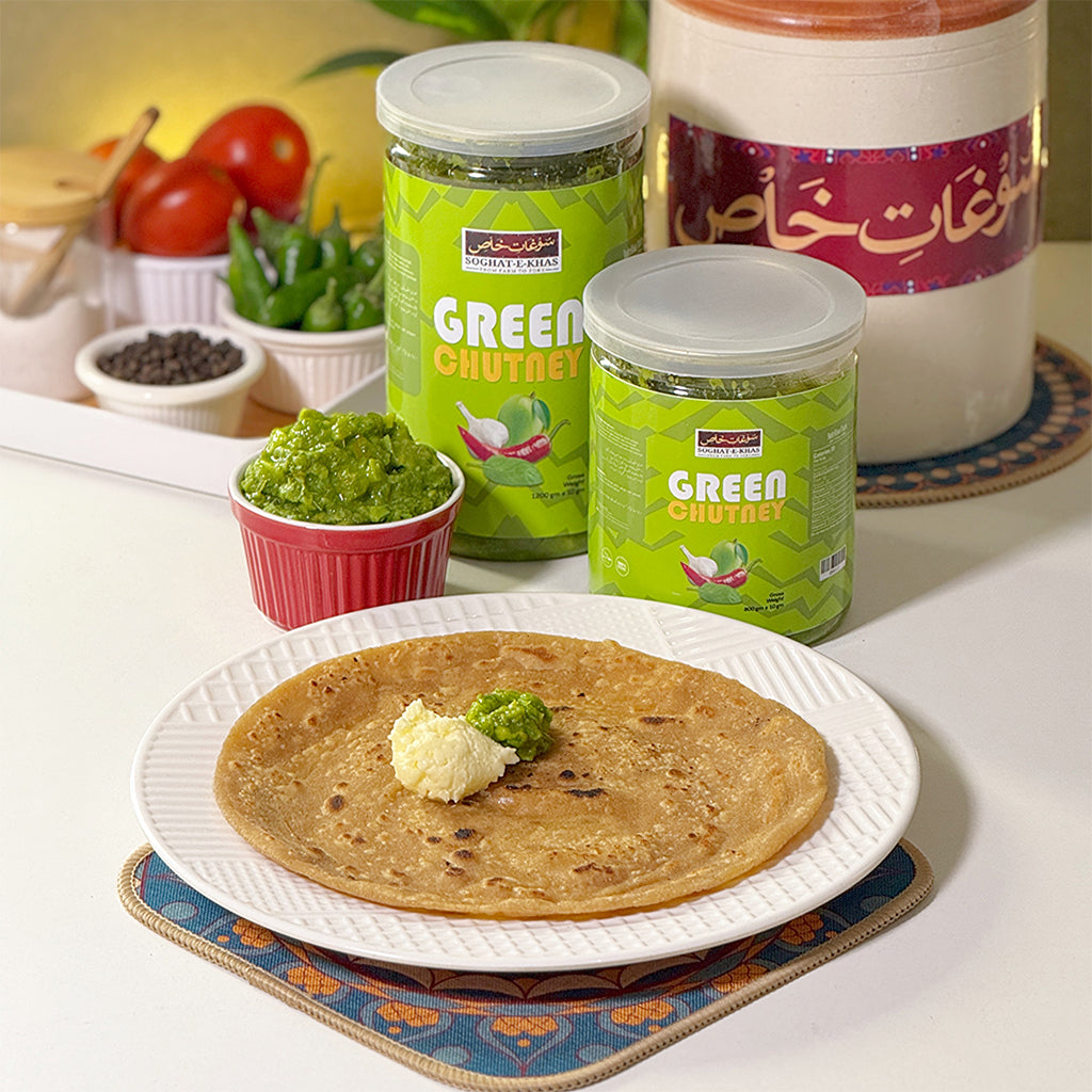 Experience a bold kick of flavor with our Green Sauce Chutney, a vibrant blend of raw mango, fresh mint, and spicy green chilies. This desi-style chutney is a staple in many Pakistani homes—perfect for adding tang, spice, and freshness to any meal.