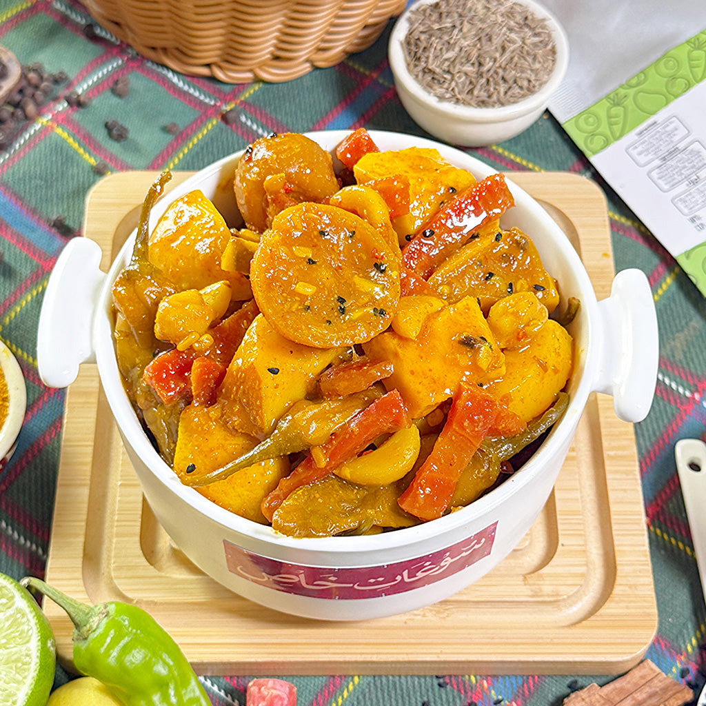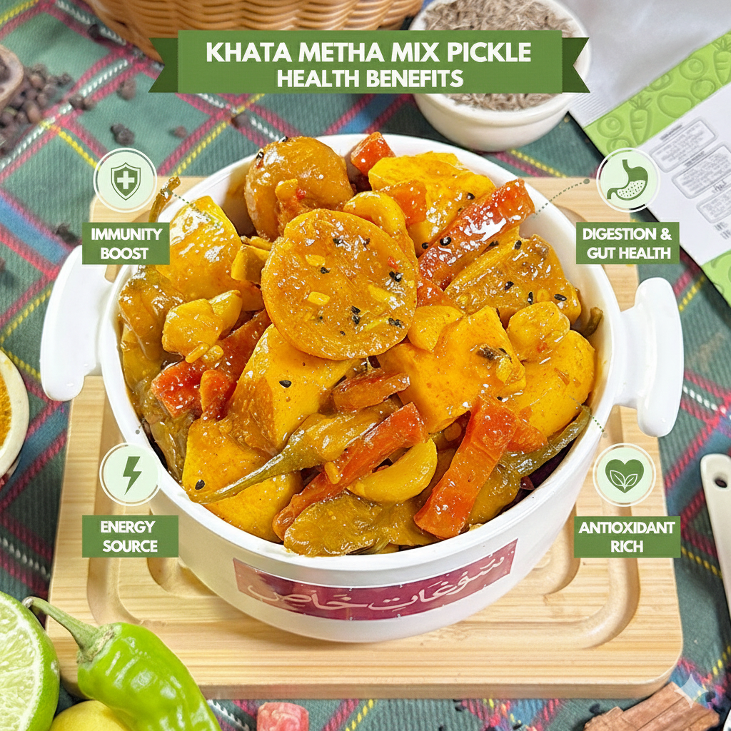 Khata Metha Mix Pickle is a much-loved traditional Pakistani achar known for its perfect balance of sweet, tangy, and mildly spicy flavors. Made from a carefully selected mix of fruits and vegetables, this achar delivers a comforting, home-style taste that pairs beautifully with everyday desi meals.