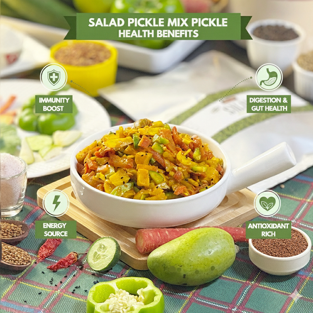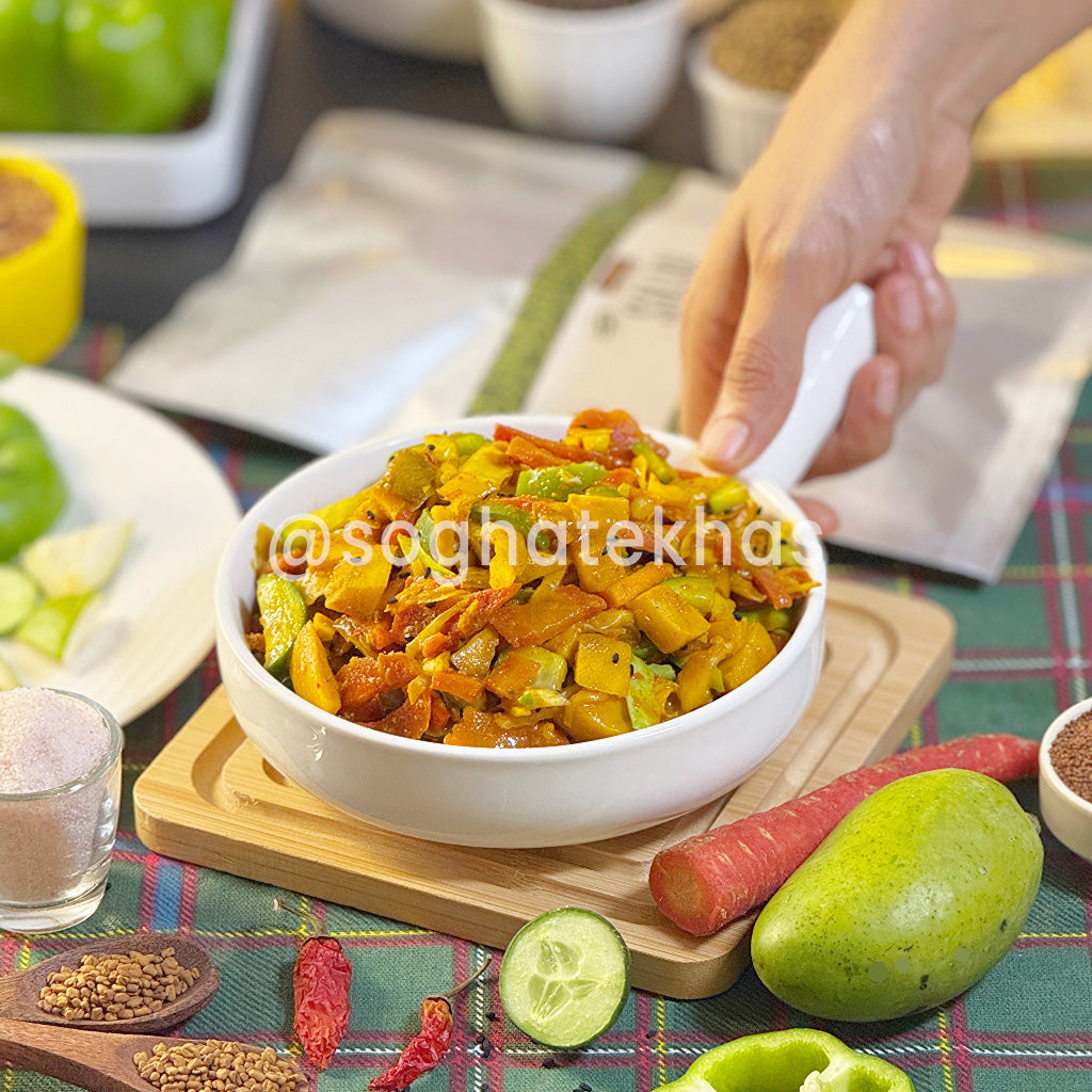 Salad Pickle is a colorful medley of fresh-cut vegetables preserved in a tangy, lightly spiced marinade. Unlike traditional achars, this version is milder and designed to complement salads, sandwiches, and light meals—offering crunch, color, and a zing of flavor with every bite.