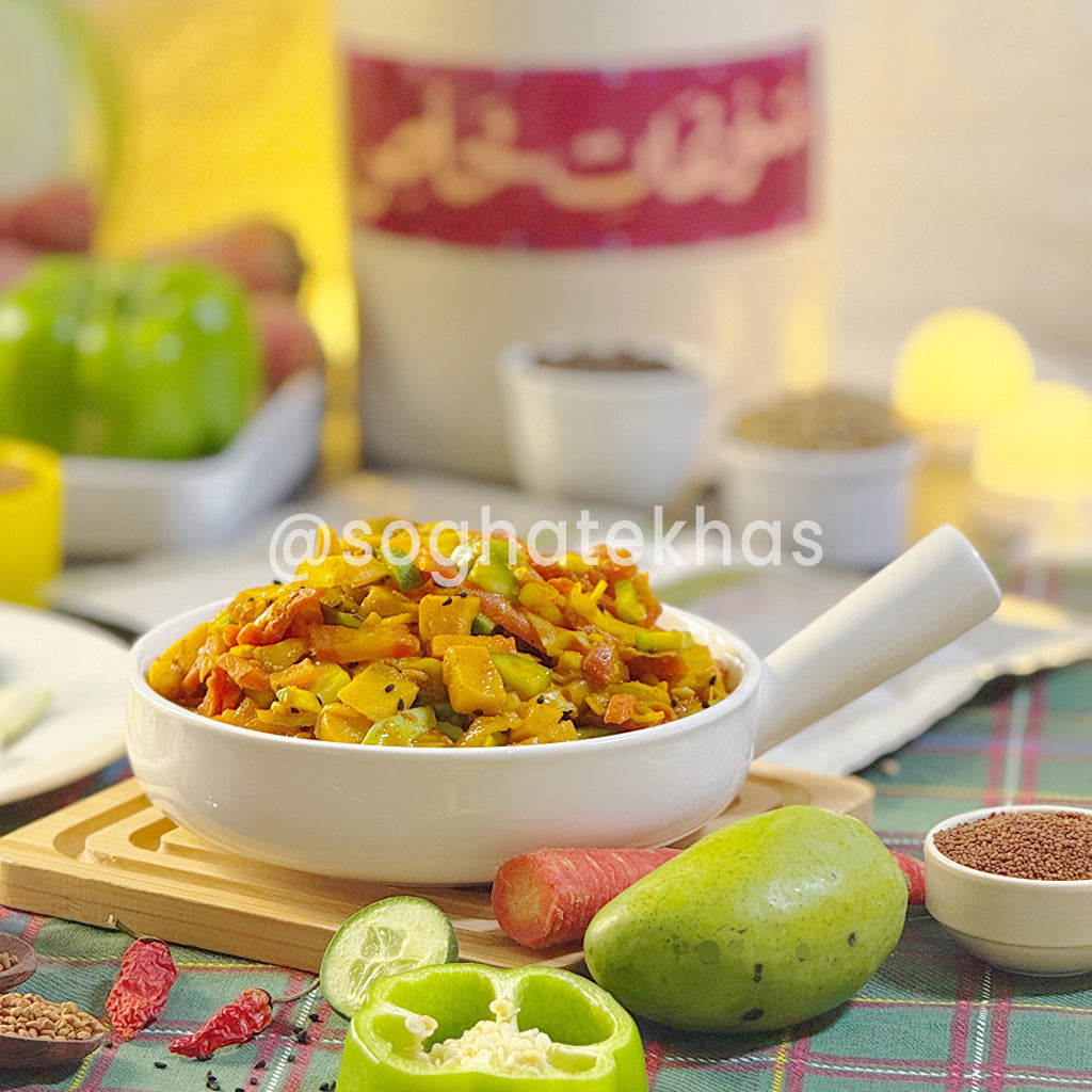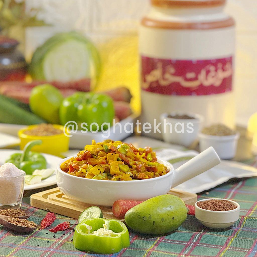 A favorite among modern pickle lovers, our Salad Achar is available in Lahore, Karachi, Islamabad, and delivered nationwide via Soghat-e-Khas. Ideal for those who enjoy variety without overwhelming heat or oil.