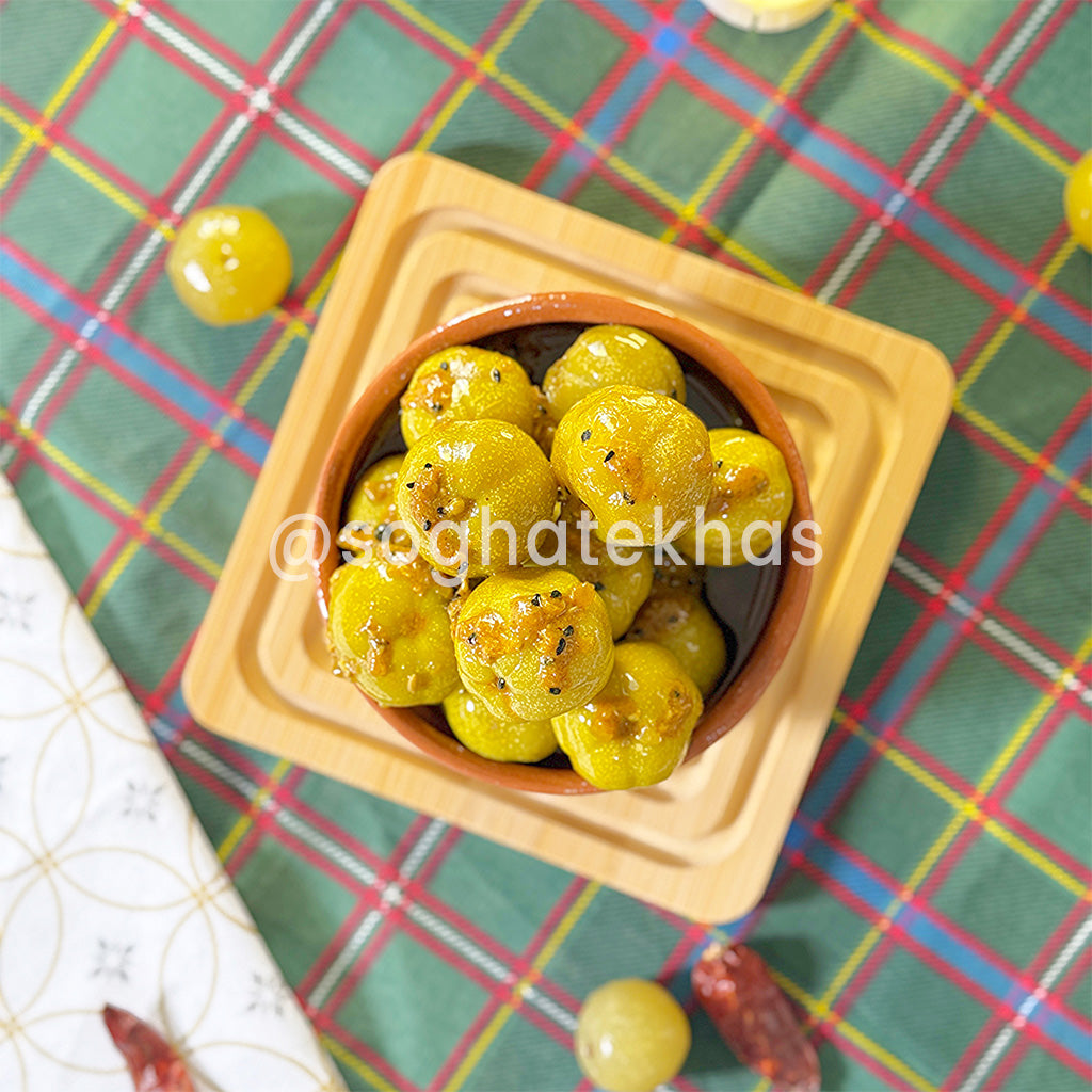 Amla Pickle, also known as Amlay ka Achar, is a traditional desi achar made from amla (Indian gooseberry). It’s known for its bold, tangy flavor and slightly bitter undertone, beautifully balanced with desi spices. This pickle is a staple in many households for its sharp taste and rich masala profile.